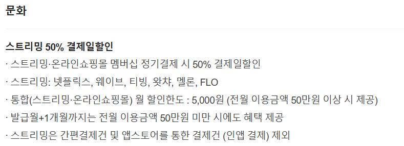 -주요 혜택 : 톡톡 O카드는 무려 OTT 플랫폼 100% 할인의 위엄을 자랑한다. 물론 월 할인한도가 1만 원이니까 약간 아쉬운 점은 역시 있다. 그래도 프리미엄 17000원을 결제한다고 보면 두 달 만에 연회비 이상의 가성비를 뽑아낼 수 있는 장점이 있다.
